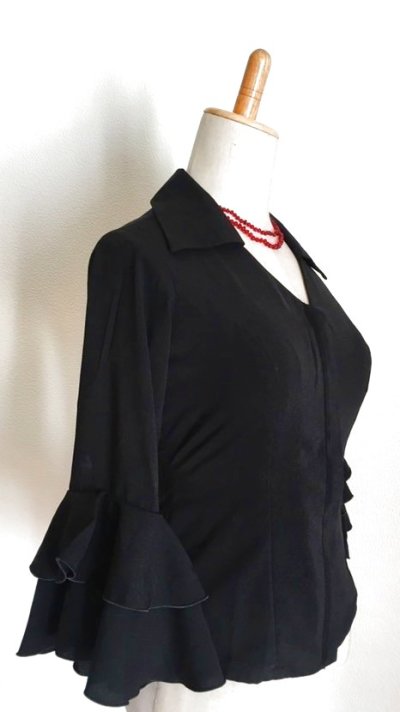【詳 細】襟つき、袖は5分丈、袖フリル2段、前ジッパー