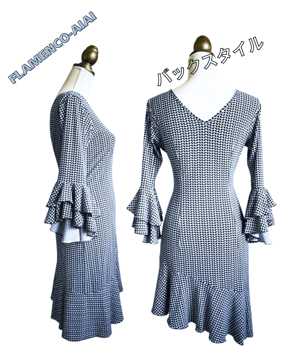 V襟(前後とも)、裾フリル1段フリル、袖フリルは2段