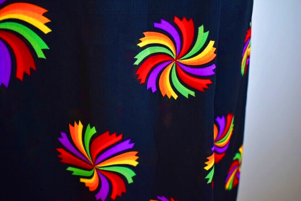 黒色がベース。レインボーフラワー柄。やや透け感があります