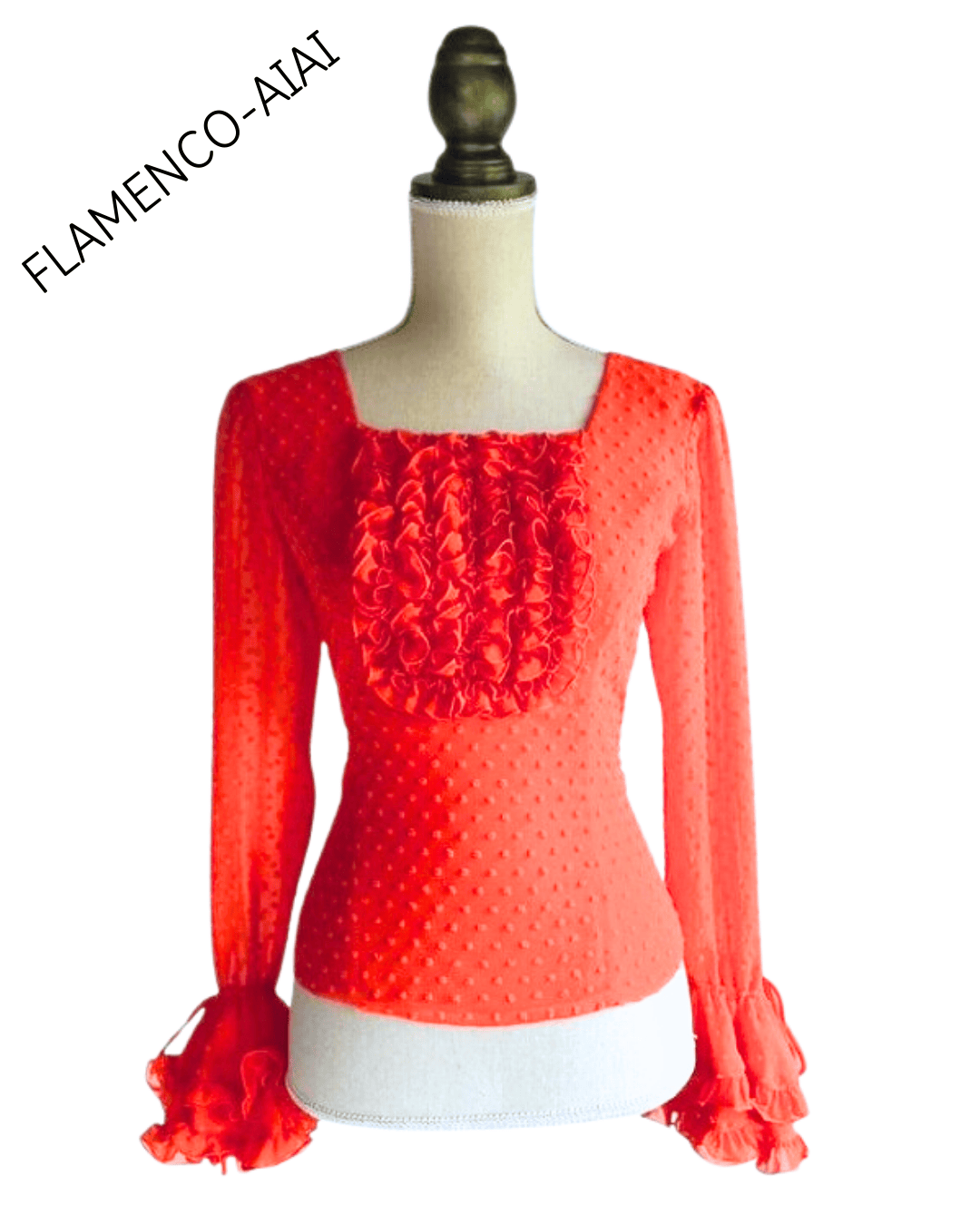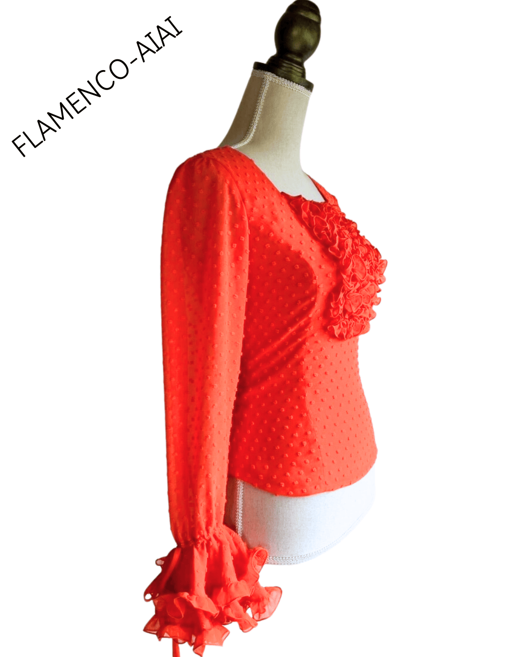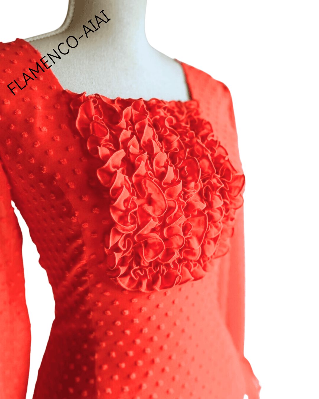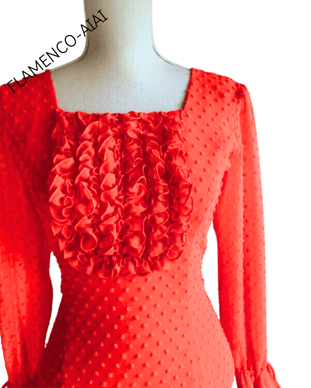 【生地・素材】ジョーゼット生地、立体水玉生地。オレンジ色、ポリエステル